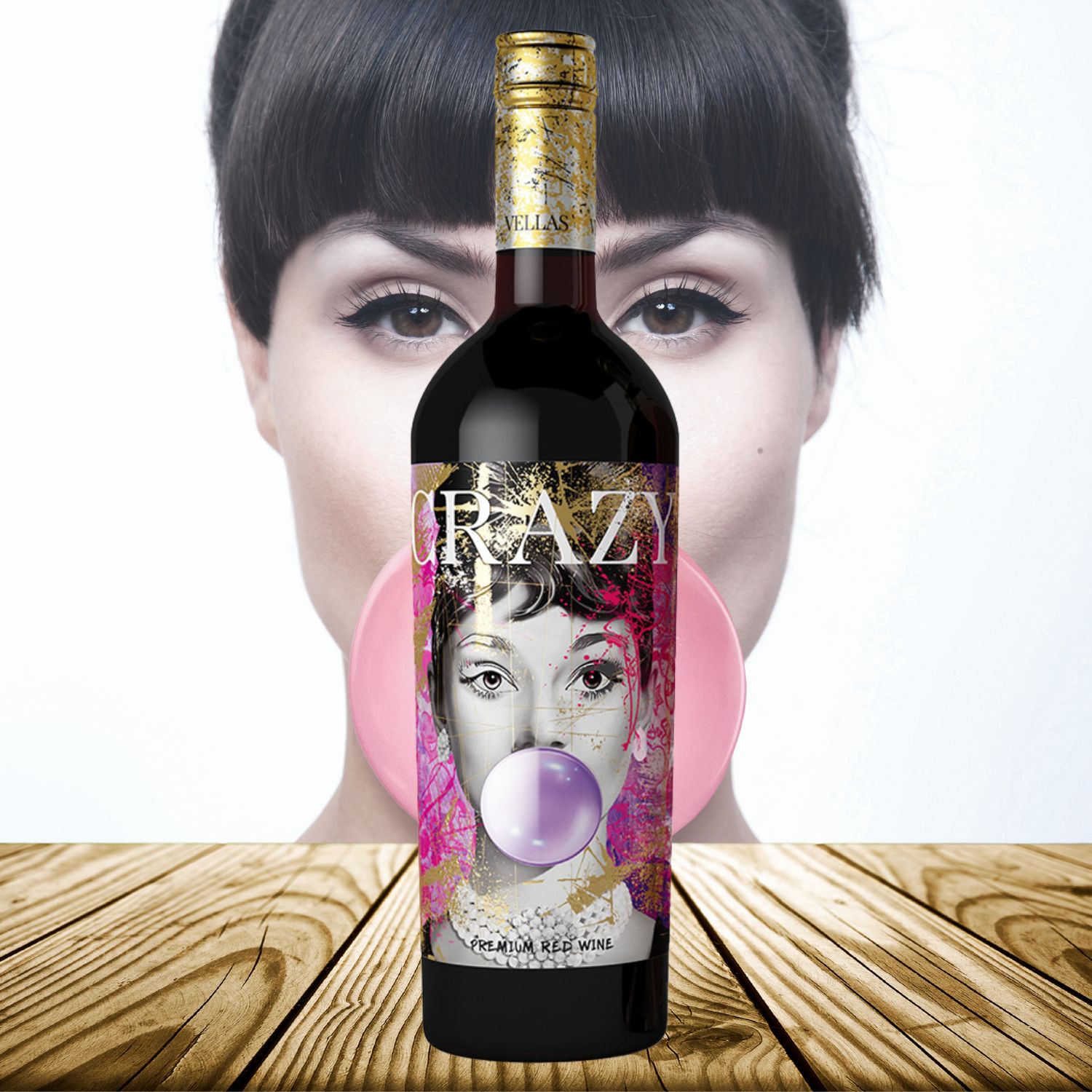Das Etikett des Crazy Merlot-Syrah ist ein echter Blickfang: Eine moderne Illustration im Pop-Art-Stil zeigt eine Frau mit Perlenkette, die lässig einen Kaugummi aufbläst – eine augenzwinkernde Hommage an Audrey Hepburn und die Ära rebellischer Eleganz. Goldene Akzente und ein knalliges Pink setzen kraftvolle Kontraste – ganz im Sinne des Weins: expressiv, selbstbewusst und mit einem Hauch künstlerischer Verrücktheit. Diese Flasche ist nicht nur ein fruchtiger Rotwein, sondern ein Statement. Die Serie umfasst außer dem Merlot-Syrah den Crazy Grenache-Syrah Rosé und den Crazy Colombard-Sauvignon – drei Weine, drei Farben, ein Stil: laut, elegant und zugänglich.
