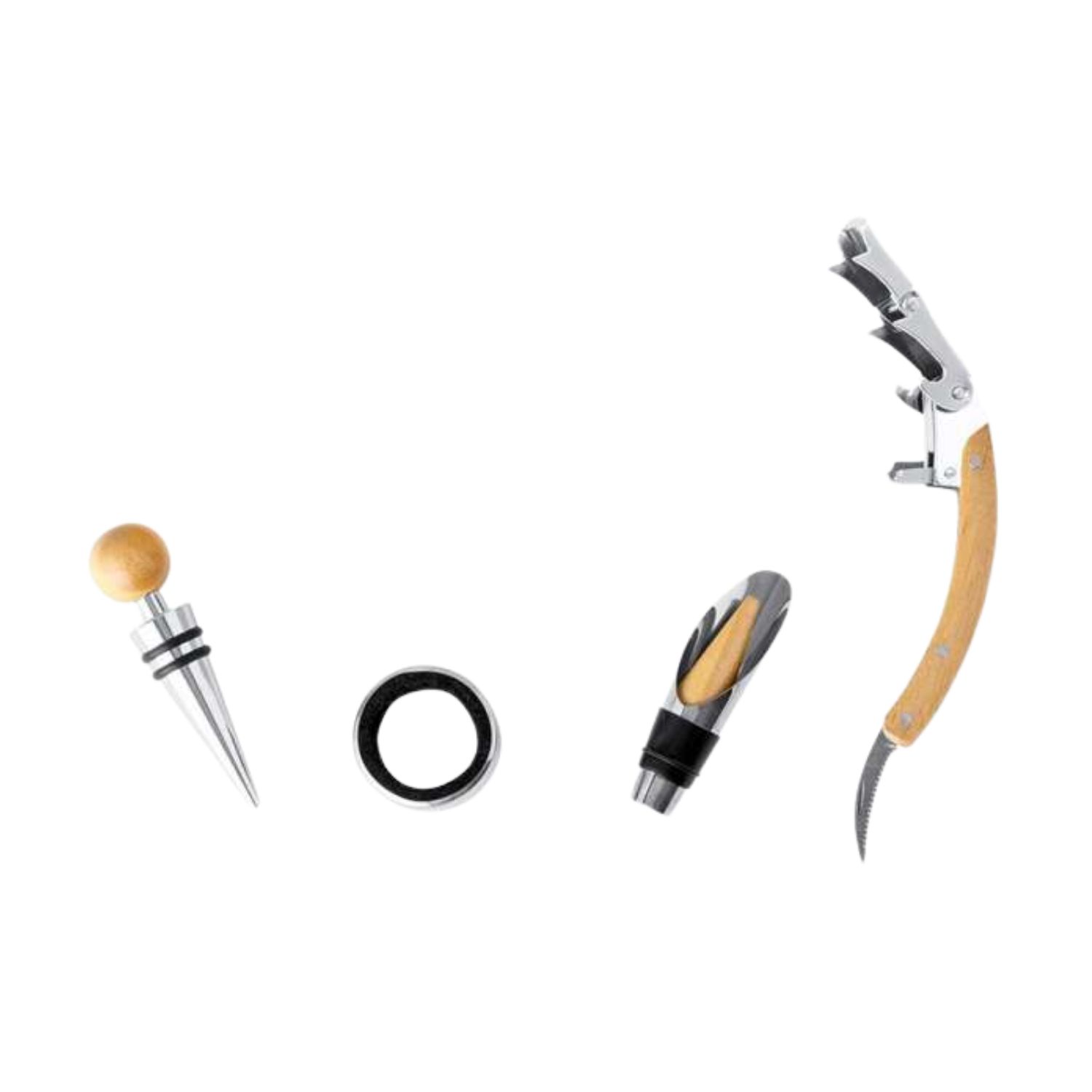 Im unteren Teil der Bambusbox befindet sich das Wein-Zubehör, eingebettet in eine passgenaue Schaumstoffeinlage. Enthalten sind ein Korkenzieher mit integriertem Kapselschneider, ein Flaschenöffner, ein Stopfen, ein Ausgießer beziehungsweise Dekanter sowie ein Tropfring. Jedes Teil hat seinen festen Platz, nichts klappert oder wirkt zufällig. Das Zubehör ergänzt den Genuss sinnvoll, ohne vom eigentlichen Erlebnis abzulenken.